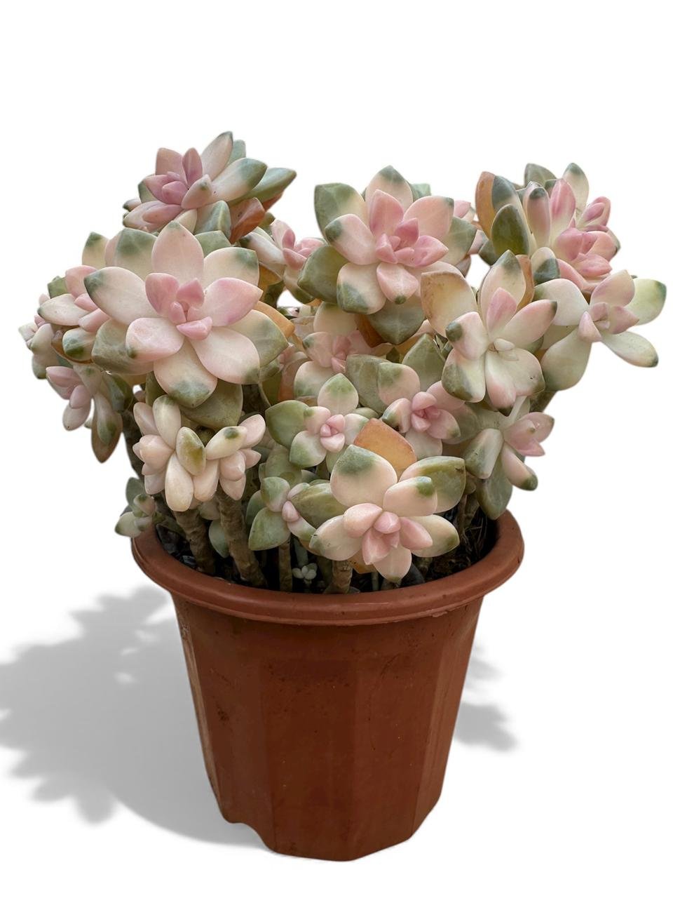 A stunning ornamental succulent featuring fleshy rosette leaves in soft shades of pink, green, and cream. Perfect for indoor styling, gifting, or adding a touch of elegance to your workspace. Low-maintenance and ideal for UAE climates. Comes in a ridged brown pot.
