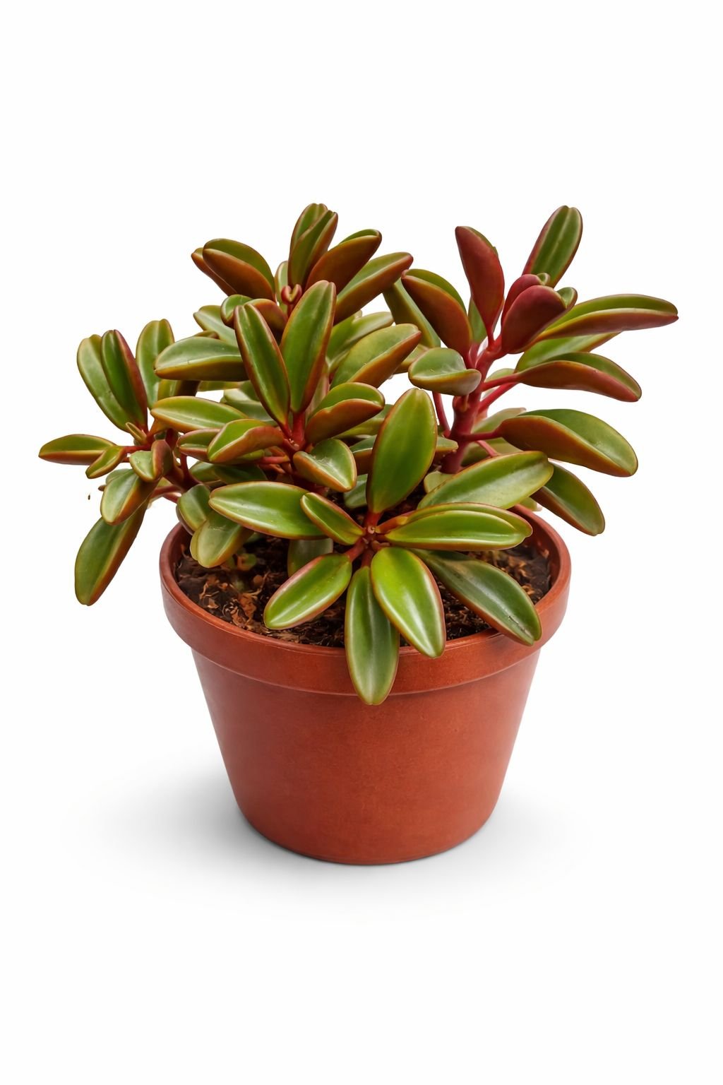 Distinctive succulent leaves with bright green tops and rich ruby-red undersides create a bold decorative look.